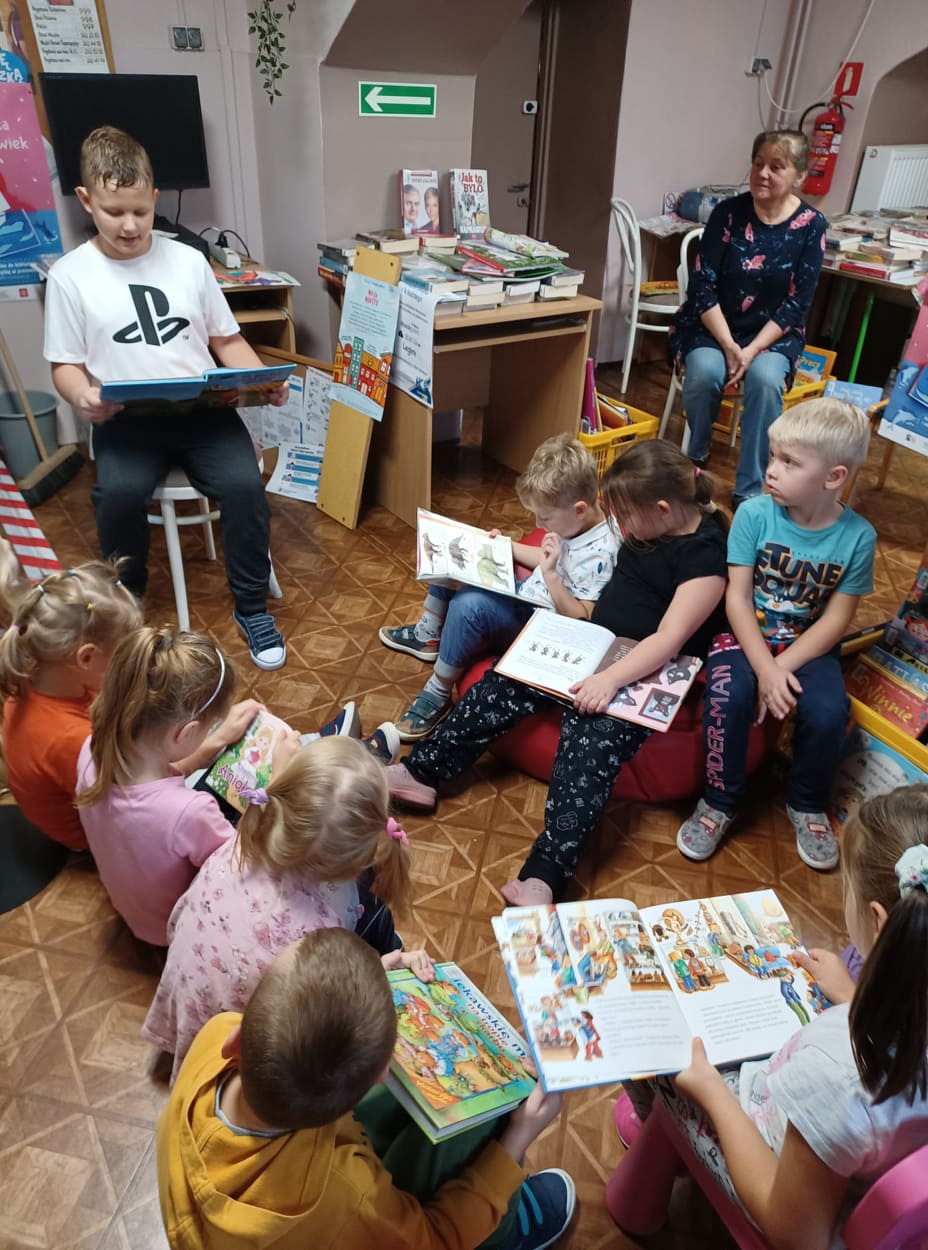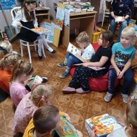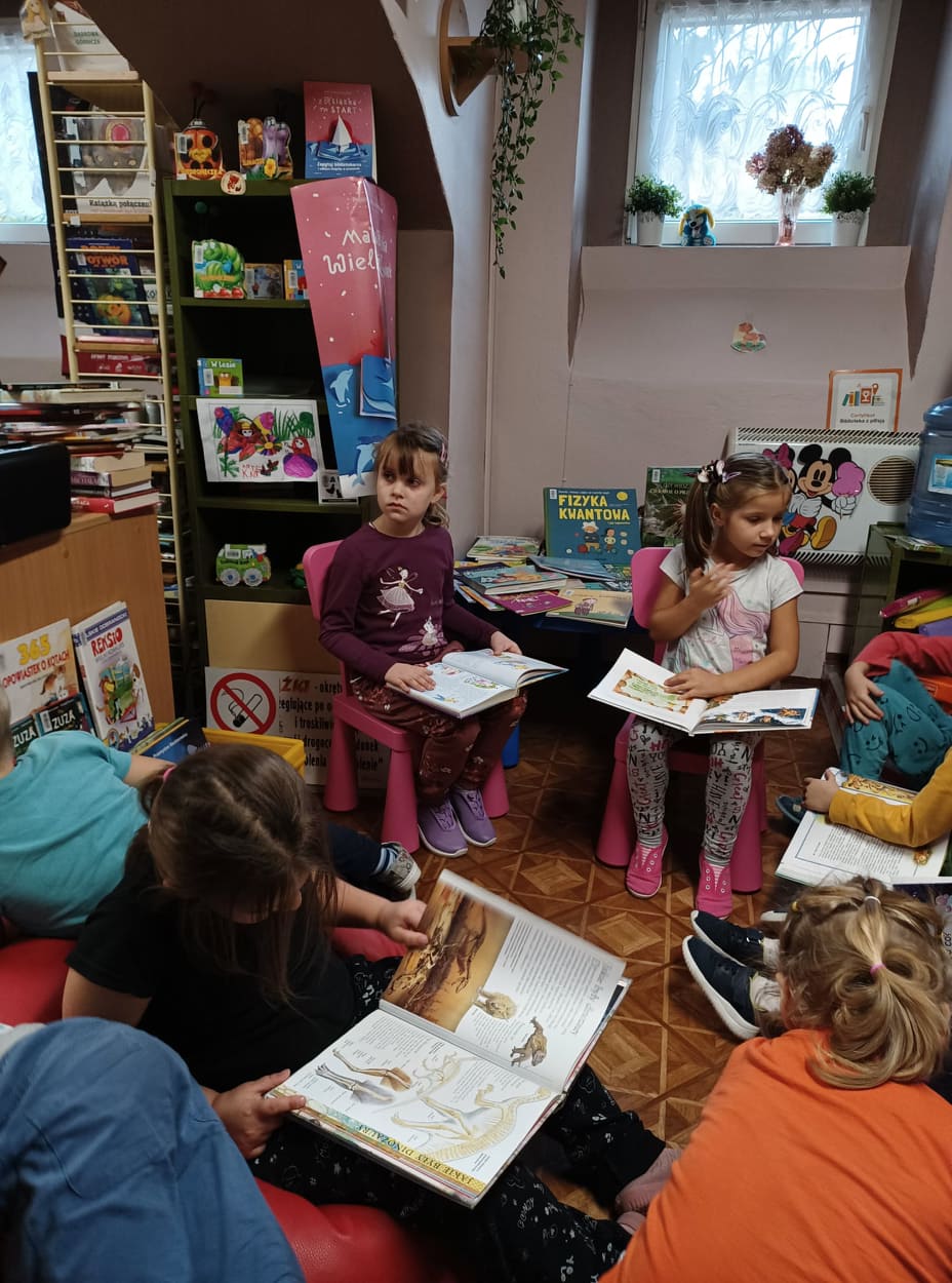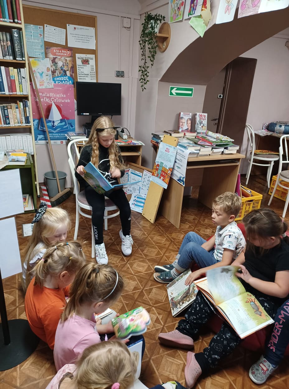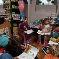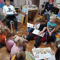 Przedszkolaki z grupy Dąbrowskie Bobry odwiedziły Miejską Bibliotekę Publiczną Filia nr 14 w Dąbrowie Górniczej, gdzie przeprowadzone zostało dla nich głośne czytanie wybranych przez dzieci książek. Dla młodszych dzieci książeczki – bajeczki czytali ich starsi koledzy oraz panie bibliotekarki (z MBP i biblioteki szkolnej). Mali czytelnicy byli żywo zainteresowani kolorowymi książeczkami.